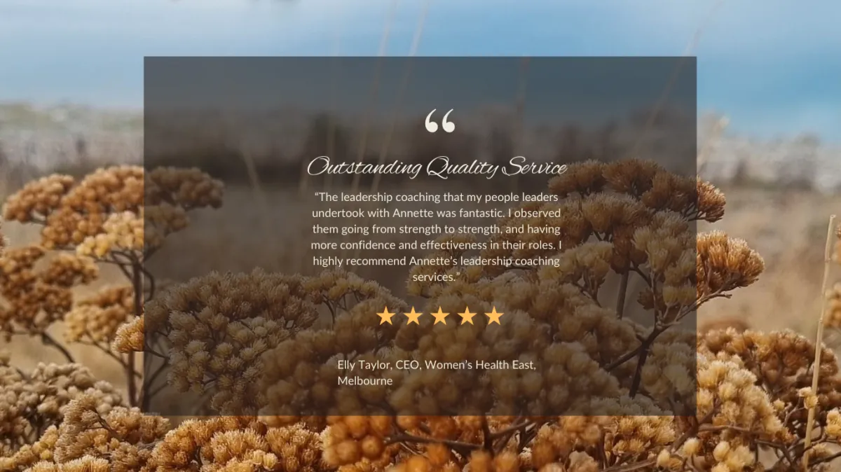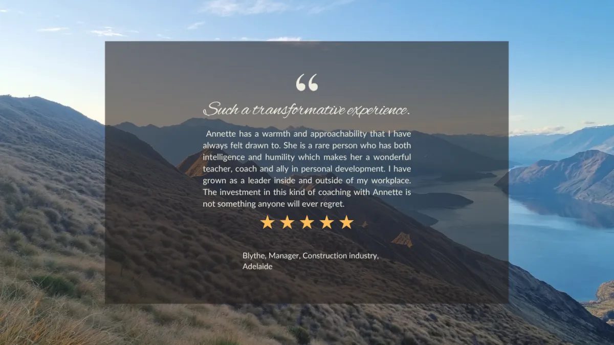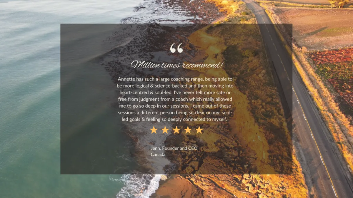 After a very challenging year, I felt like my old, happy, supercharged self as I entered the new year after completing the coaching program. I would highly recommend Annette's coaching if you want to transform your life and get it to stay that way!